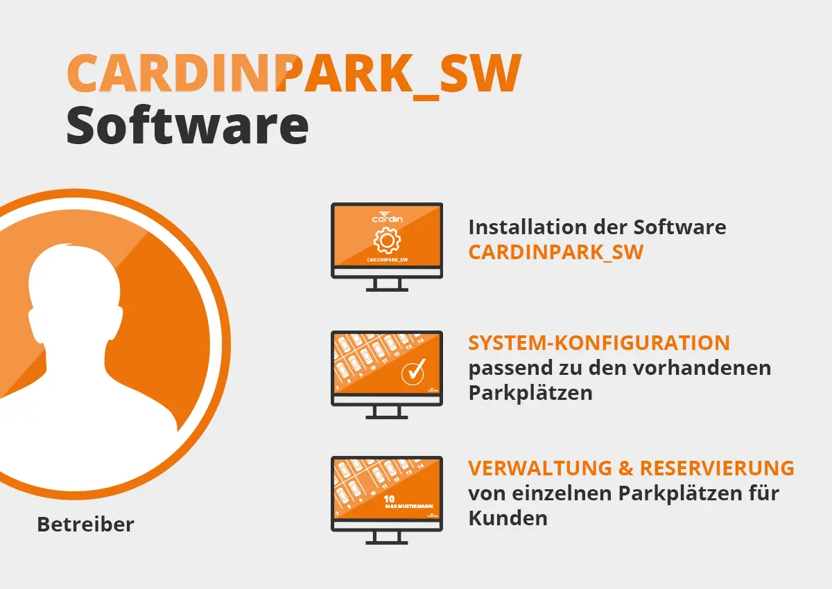 In Verbindung mit der PC-Software CARDINPARK_SW ist das Parkplatz-Management kinderleicht. Konfiguriert wird das System ganz einfach am Computer. Anschließend wird es dem Betreiber ermöglicht, einzelne Parkplätze für