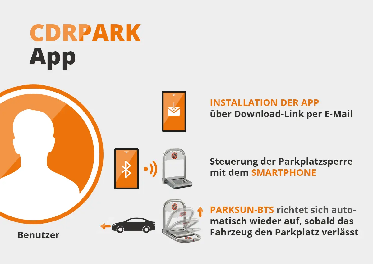 Mit der App CDR-PARK (verfügbar für iOS & Android) können die Parkplatz-Nutzer den PARKSUN-BTS Parkbügel für die Dauer ihrer Reservierung bequem über ihr Smartphone steuern und so das Parken effizienter und komfortabler gestalten.